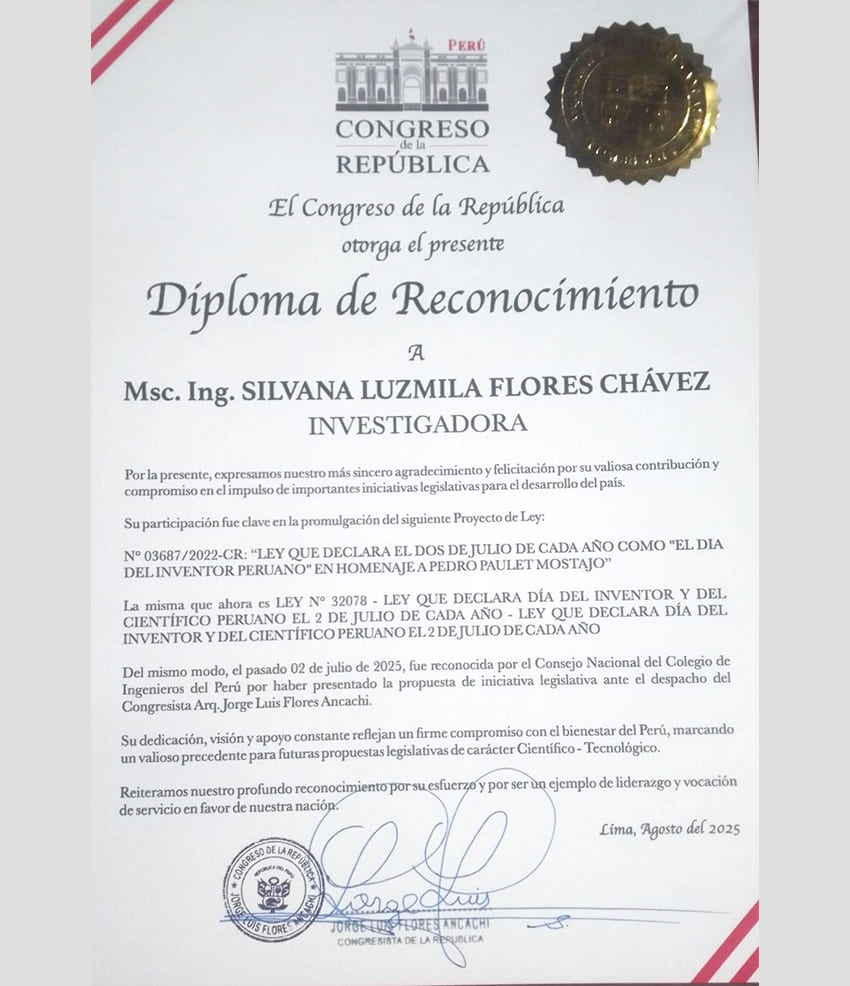 En agosto del 2025, la Msc. Ing. Silvana Luzmila Flores Chávez, fue reconocida con un Diploma de Reconocimiento por el congresista, Dr. Jorge Luis Flores Ancachi, que otorgo dicho reconocimiento por valiosa contribución y compromiso en el impulso de importantes iniciativas legislativas para el desarrollo del país, principalmente, por la participación clave en la promulgación del siguiente proyecto de ley N° 3687/2022-CR: “LEY QUE DECLARA EL DOS DE JULIO DE CADA AÑO COMO EL DÍA DEL INVENTOR PERUANO” EN HOMENAJE A PEDRO PAULET MOSTAJO”, la misma que ahora es LEY N° 32078-LEY QUE DECLARA DIA DEL INVENTOR Y DEL CIENTÍFICO PERUANO EL 02 DE JULIO DE CADA AÑO. Para mayor detalle ver la Foto N 4. Diploma de Reconocimiento a Msc. Ing Silvana Luzmila Flores Chávez.