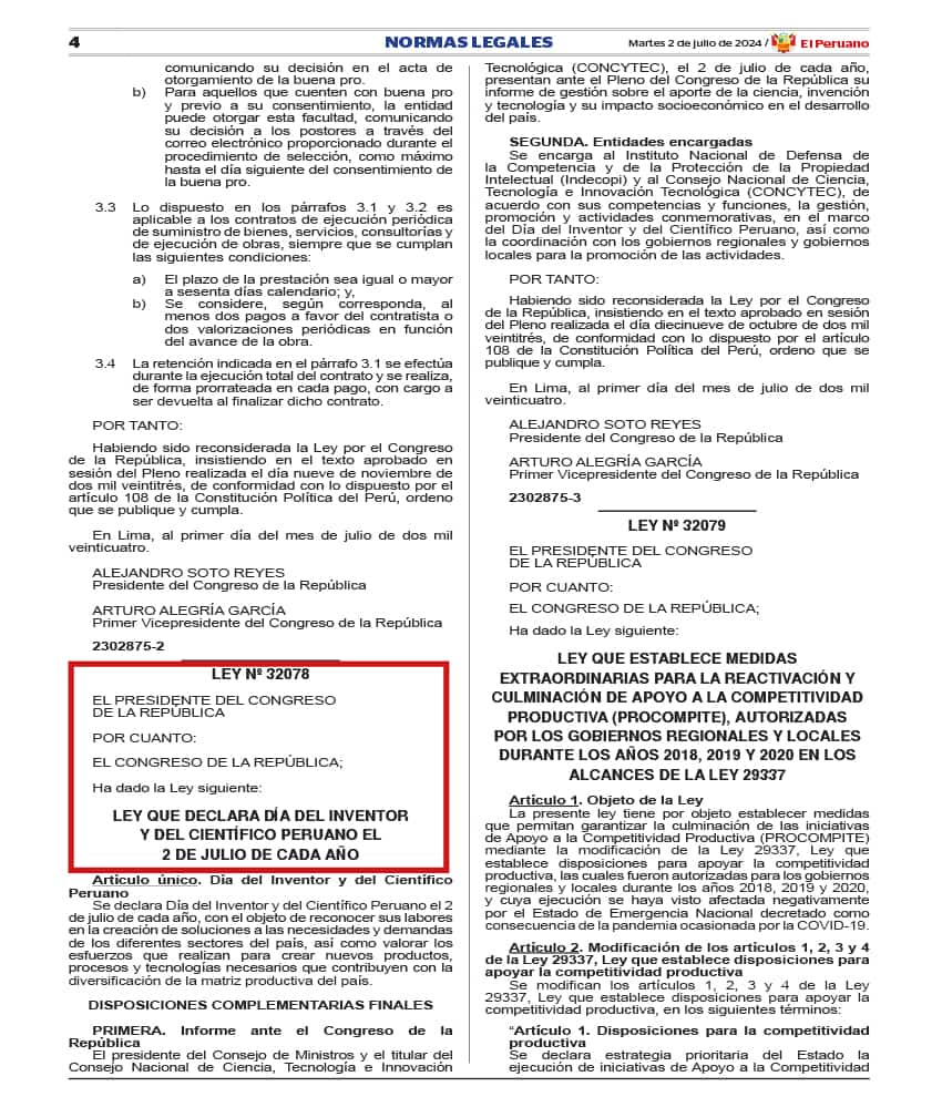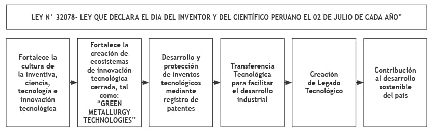 Cabe resaltar, que la Ley N° 32078-Ley que declara el 2 de julio como el “Día del Inventor y del Científico Peruano” constituye una base legal de la protección del inventor y científico peruano en el desarrollo de su cultura inventiva, puesto que esta ley, reconoce y visibiliza el rol estratégico de los inventores y científicos peruanos para el desarrollo nacional. Asimismo, esta ley permitirá ser una ley referente en la construcción de ecosistemas de innovación cerrada, puesto que sirve como punto de partida para generar políticas públicas, incentivos y plataformas que fortalezcan la innovación tecnológica nacional. Para mayor detalle ver foto N° 3. LEY N° 32078-LEY QUE DECLARA EL DIA DEL INVENTOR Y DEL CIENTÍFICO PERUANO EL 02 DE JULIO DE CADA AÑO.