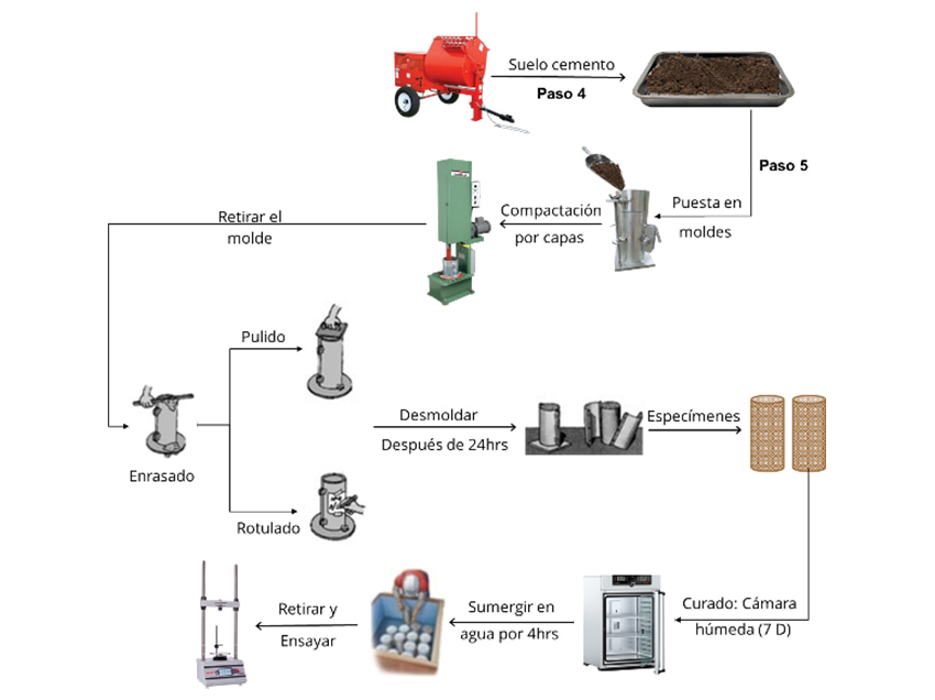 La elaboración de las probetas siguió un protocolo estandarizado para garantizar resultados confiables. El proceso comienza con la mezcla homogénea del suelo seco con cemento y el aditivo en una mezcladora de eje horizontal, controlando precisamente el tiempo de mezclado para dispersar adecuadamente las nanopartículas sin formar aglomeraciones.