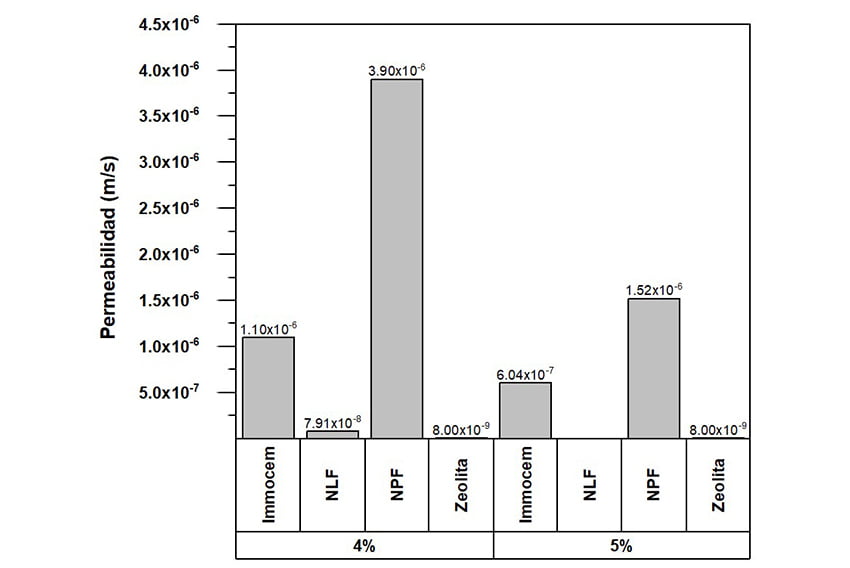 NLF, aunque presenta valores de permeabilidad superiores a los otros aditivos evaluados, se mantiene dentro de los niveles adecuados para aplicaciones hidráulicas donde se requiere un control moderado de filtraciones sin necesidad de impermeabilidad total.