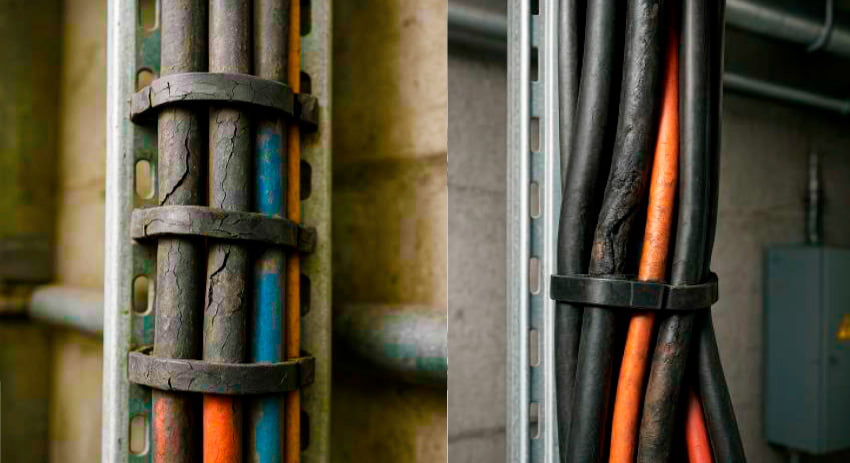La degradación prematura de los amarres convencionales no solo afecta la integridad física del cableado, sino que puede derivar en tensiones en terminales, pérdida de espaciado, elevación de temperatura y riesgo de cortocircuito por compactación. En entornos críticos como minería, plantas industriales o canalizaciones de media tensión, estas fallas generan interrupciones no programadas, riesgos operativos y sobrecostos de mantenimiento.